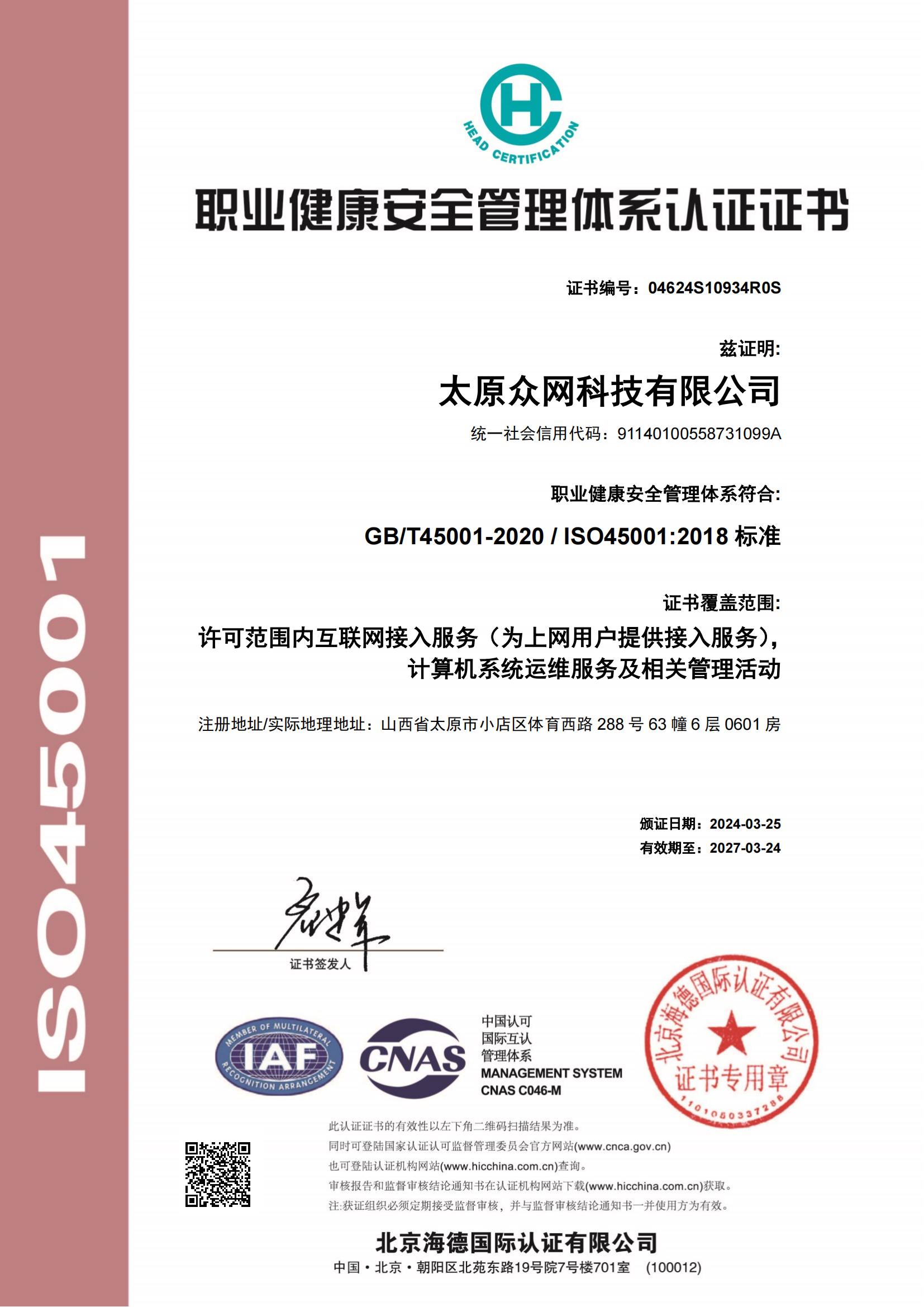 ISO45001-职业健康安全管理体系认证证书