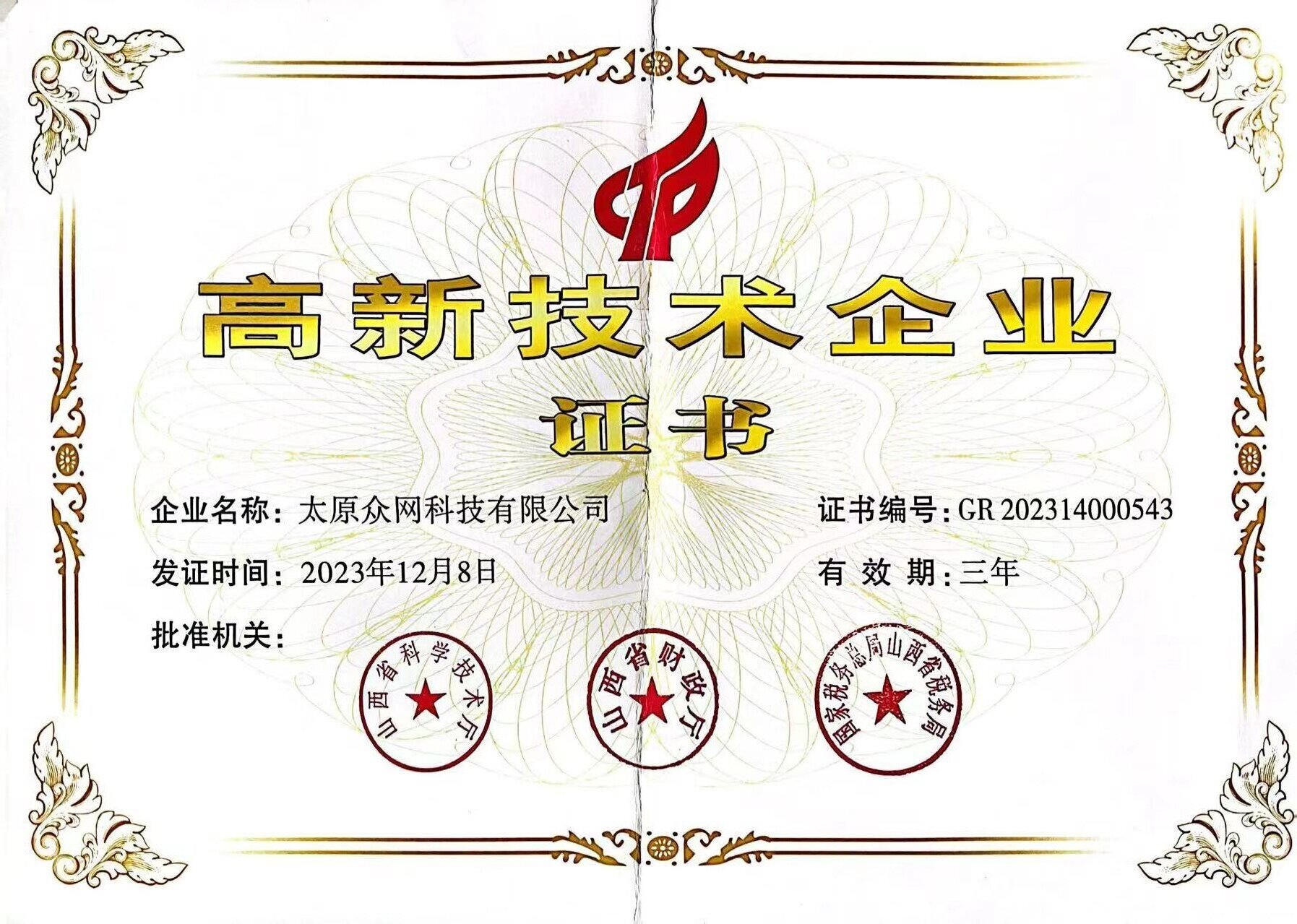 高新技术企业证书