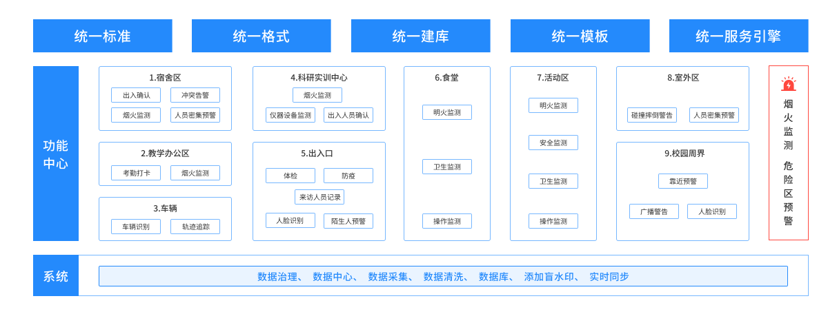 将人员基础信息、人脸数据和人脸比对能力统一赋能至校内各部门人脸智能业务系统中,统一标准、统一格式、统一建库、统一模板、统一服务引擎、统一数据接口,实现各部门按需取用和人脸业务精准应用,实现有脸可刷、有库可比对。创造主动式、协同式的智慧安防环境。